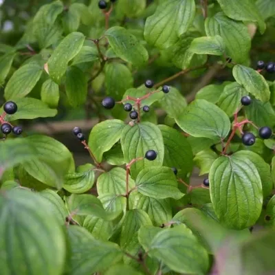 Cornus alba – Hvid kornel – Busk ca. 3 m. høj med rødlige grene. Hvide blomster i halvskærme i maj-juni. Hvide frugter i september-november. – Trives i alle jordtyper. Tåler lidt fugtig jord. Tåler sol-skygge Tåler nogen blæst. Salgshøjde: 50-80 cm. – Barrodet bundt a’ 10 stk.