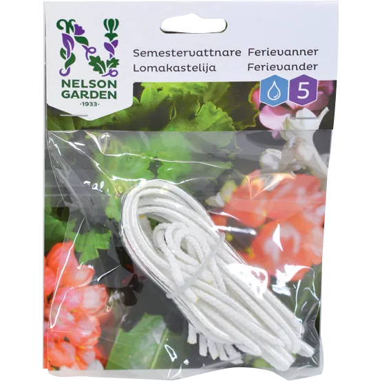 Vander potteplanterne automatisk. Læg hele vanderen i blød natten over, sørg for at hele snoren ligger i blød. Dette er viktig for at ferievanderen fungerer. Lav et ca 4 cm dybt hul i pottejorden. Sikre dig at tråden stikker ca 4 cm ud af plastrørsenden, som skal stikkes ned i jorden. Stik enden ned i hullet og tryk jorden godt til. OBS! Plastrøret skal være stukket ned i jorden. Placere den anden ende i en skål el. lign. som fyldes op så vandoverfladen ligger lidt under jordniveuet i potten. Hvis vandoverfladen står højere en jorden i potten kan planten let få for meget vand. Kontrollere at ferievanderen fungerer (gerne i mindst et døgn) ved at se efter at vandet virkelig føres gennem snoren. Ferievanderen bør efterses en gang om ugen hvis du skal være bortrejst i længre tid. OBS! Enkelte vandkrævende planter bør forsynes med 2 stk. ferievandere. Anvendes i 3-6 uger.