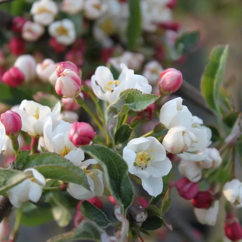 Langsomtvoksende lille træ med kugleagtig krone. Hvide/sart rosa blomster i foråret, små røde frugter i efteråret. Bruges som overstander i bedet eller som krukkeplante.