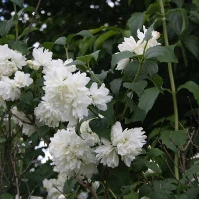 Philadelphus virginalis ‘Schneesturm’ – Uægte jasmin bliver en 2-3 m høj busk. Mange hvide, fyldte, let duftende blomster i juni. Trives i sol-halvskygge – i alm havejord – Salgshøjde: 30-50 cm. – Barrodet bundt a’ 10 stk.