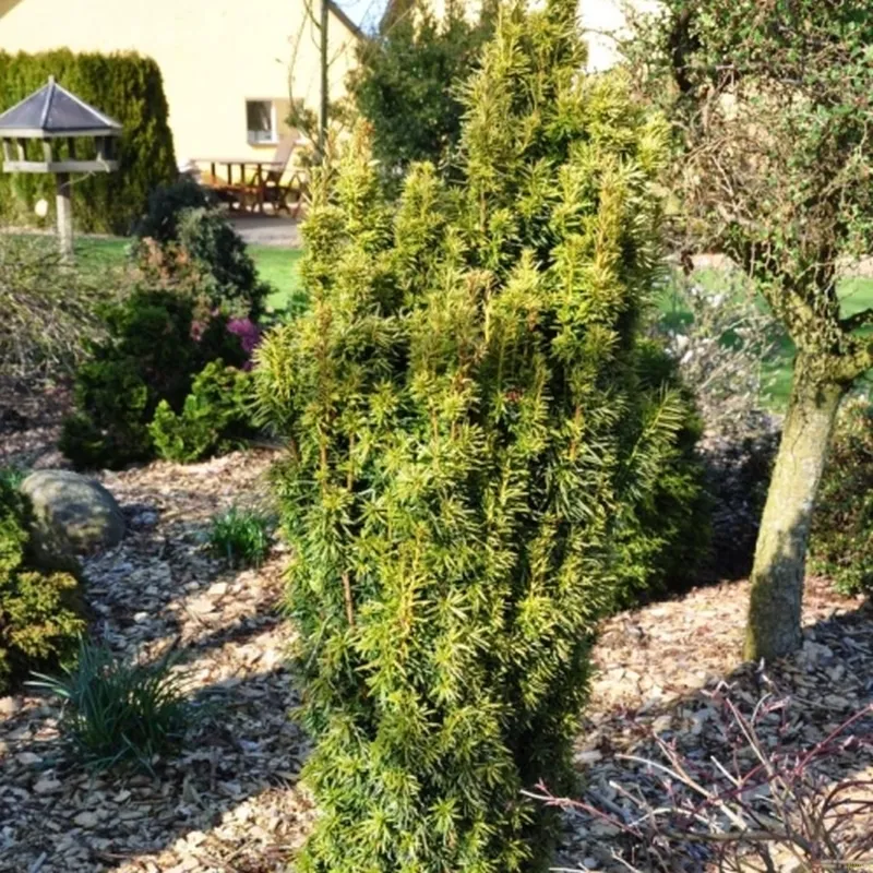 Tæt, stift, opretvoksende, stedsegrøn busk med smal, regelmæssig, søjleformet vækst og mørkegrønne nåle . Placering i sol – dyb skygge. Bærer røde frugter, giftige bær.